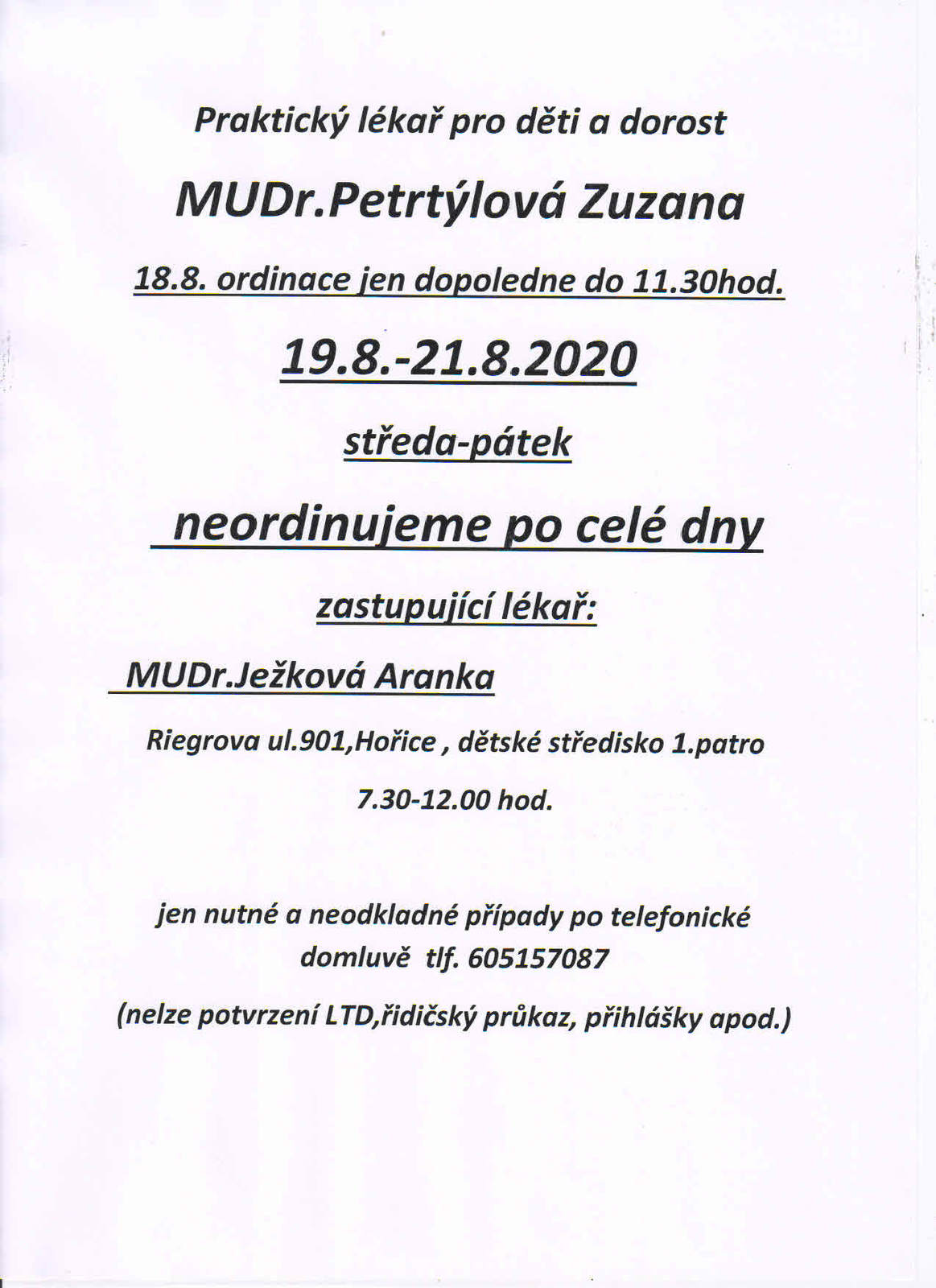 MUDr. Petrtýlová Zuzana - neordinuje od 19.8. - 21.8.2020