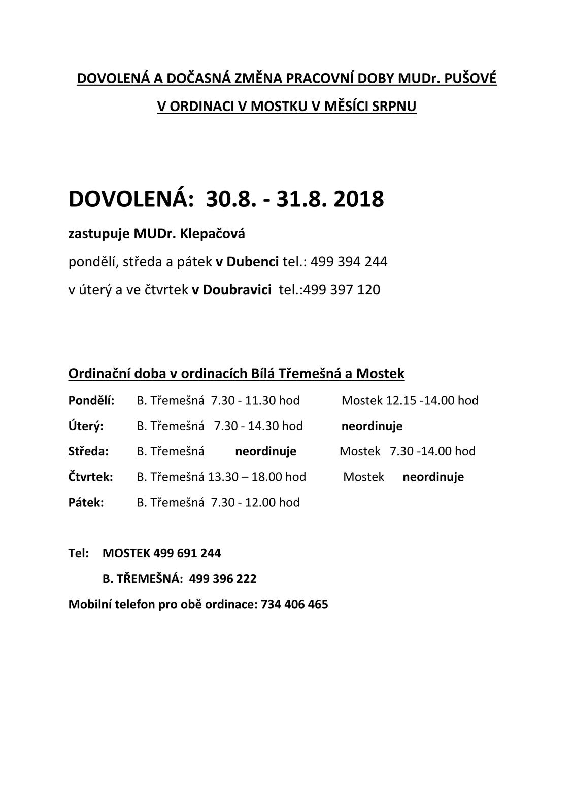 MUDr. Pušová -dovolená a změna pracovní doby čtvrteční ordinace Mostek (srpen 2018)