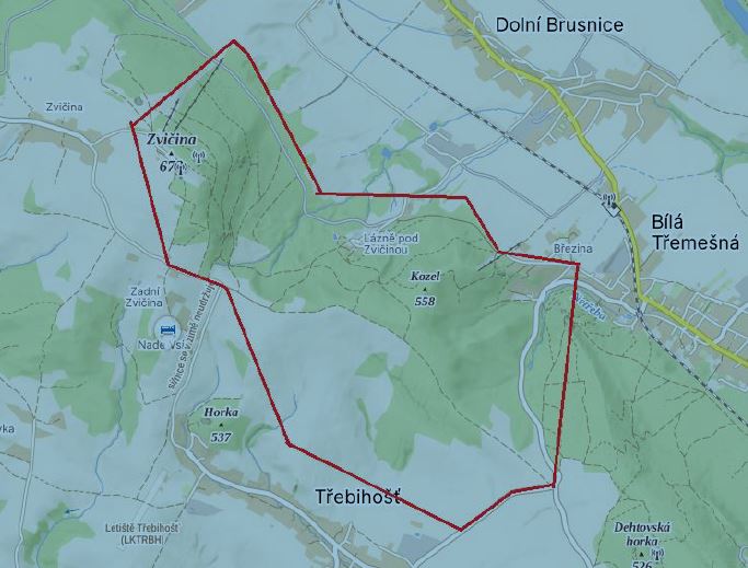 Oznamujeme Vám, že dne 13.12.2025 v době od 8:00 do 17:00 bude v lokalitě mezi Zvičinou, Bílou Třemešnou a Třebihoští (mapa níže) probíhat společný hon na divoká prasata.