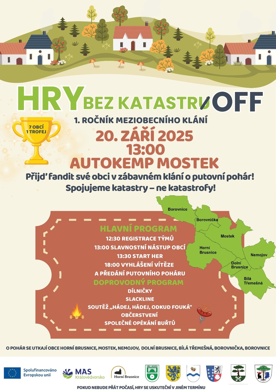 Soutěže se zúčastní celkem 7 obcí: Horní Brusnice, Mostek, Nemojov, Dolní Brusnice, Bílá Třemešná, Borovnička a Borovnice. Každá obec postaví 8 členný tým, jehož složení bude pestré – vítáni jsou účastníci od nejmladších dětí až po dospělé bez věkového omezení. Těšit se můžete na zábavné týmové úkoly, smích i přátelskou atmosféru.